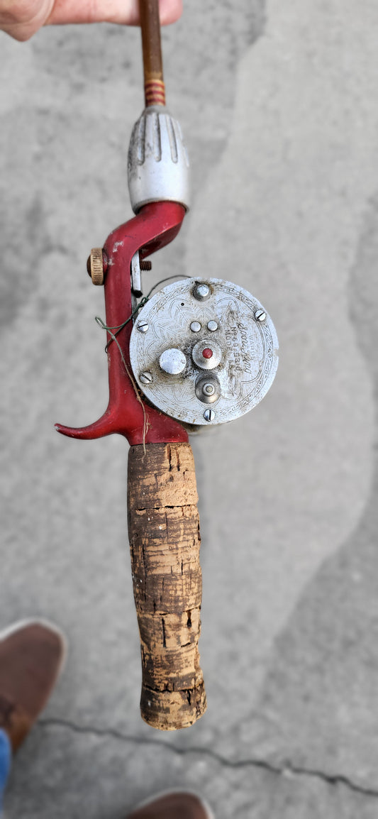 Vintage Fishing Reel and Solid Glass Rod. Montgomery Ward No. 69 6310 Model 5B Reel. 5 ft total length of Rod. Reel Made by Shakespeare.