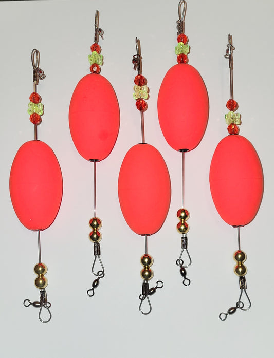 Popping Float Rigs, 5 Rigs, Bright Red, 2-1/2" Oval Floats. Choose Wire or the New Monofilament Leaders, 9 and 10 inch lengths.